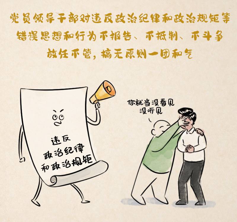 第七十五條 黨員領(lǐng)導(dǎo)干部對違反政治紀(jì)律和政治規(guī)矩等錯誤思想和行為不報告、不抵制、不斗爭,放任不管,搞無原則一團(tuán)和氣,造成不良影響的,給予警告或者嚴(yán)重警告處分;情節(jié)嚴(yán)重的,給予撤銷黨內(nèi)職務(wù)或者留黨察看處分。