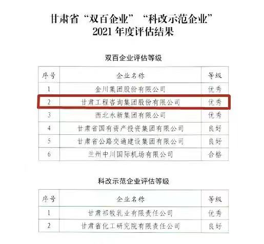 甘肅工程咨詢集團(tuán)獲甘肅省2021年度“雙百企業(yè)”評估“優(yōu)秀”等級