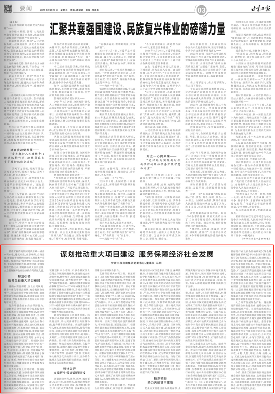 今后,甘肅工程咨詢(xún)集團(tuán)將完整準(zhǔn)確全面貫徹新發(fā)展理念,主動(dòng)服務(wù)和融入新發(fā)展格局,聚焦培育發(fā)展新質(zhì)生產(chǎn)力,以高質(zhì)量規(guī)劃、高品質(zhì)設(shè)計(jì)、高效能服務(wù),在奮力譜寫(xiě)中國(guó)式現(xiàn)代化甘肅篇章中作出新的更大貢獻(xiàn)。