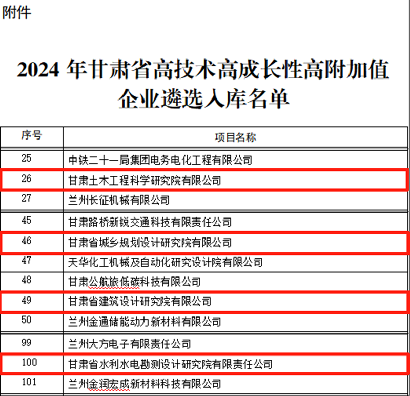 近日,甘肅省科技廳公布2024年甘肅省高技術(shù)高成長性高附加值(簡稱“三高”)企業(yè)名單,甘肅工程咨詢集團旗下省建筑設(shè)計院、省水電設(shè)計院、省城鄉(xiāng)規(guī)劃院、甘肅土木工程院從眾多企業(yè)中脫穎而出,成功登上全省首批“三高”企業(yè)榜單。