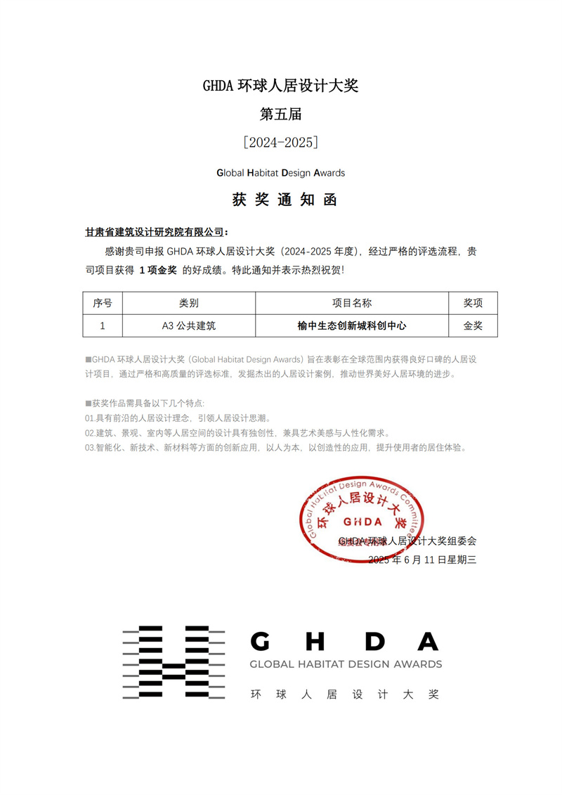 近日,備受矚目的第五屆GHDA環(huán)球人居設(shè)計大獎獲獎名單揭曉。甘肅工程咨詢集團(tuán)旗下省建筑設(shè)計院精心打造的榆中生態(tài)創(chuàng)新城科創(chuàng)中心項目,繼榮獲美國綠色建筑委員會頒發(fā)的LEED V4 BD+C鉑金級預(yù)認(rèn)證、中國綠色建筑三星級預(yù)評價兩項權(quán)威認(rèn)證后,再度摘得公共建筑類金獎,彰顯出我省在人居設(shè)計領(lǐng)域的卓越實力。