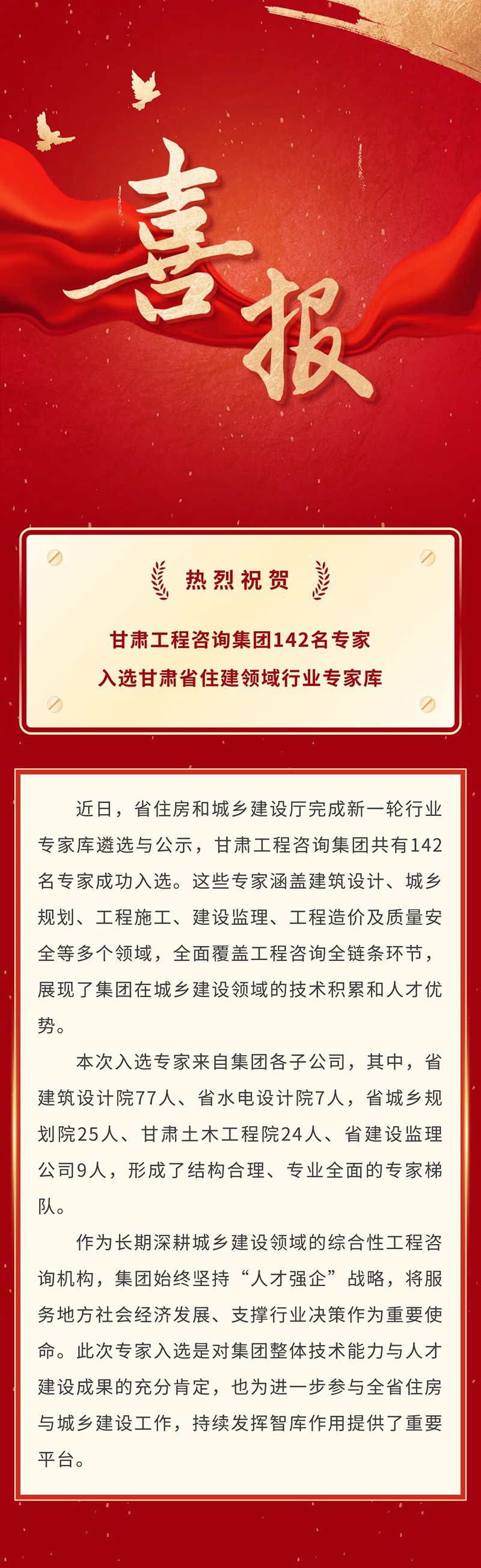 喜報(bào) | 甘肅工程咨詢集團(tuán)142名專家入選甘肅省住建領(lǐng)域行業(yè)專家?guī)?/span>
