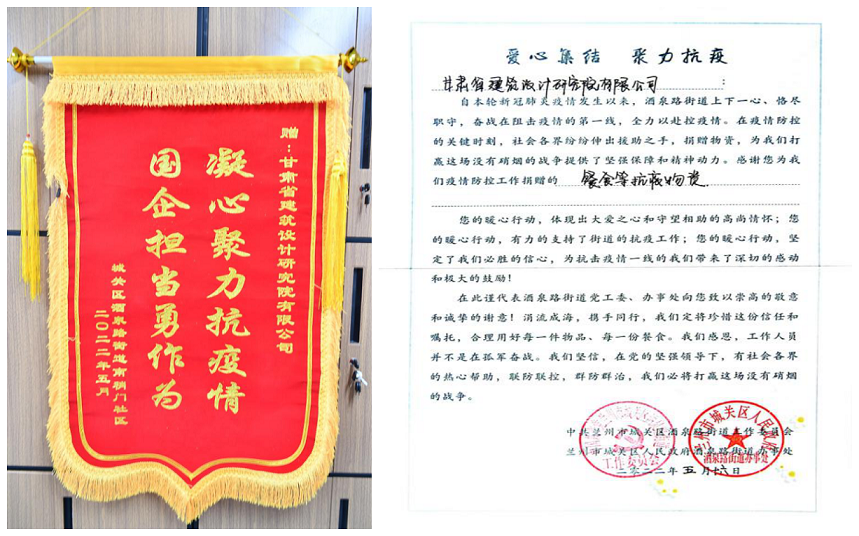 5月16日,甘肅省建筑設(shè)計(jì)研究院有限公司收到了來自蘭州市城關(guān)區(qū)酒泉路街道送來的感謝錦旗,錦旗上書寫著“凝心聚力抗疫情 國企擔(dān)當(dāng)勇作為”。建筑設(shè)計(jì)院黨委書記李向軍、總經(jīng)理曹慶、紀(jì)委書記丁永升及黨群工作部相關(guān)負(fù)責(zé)人接待來訪。