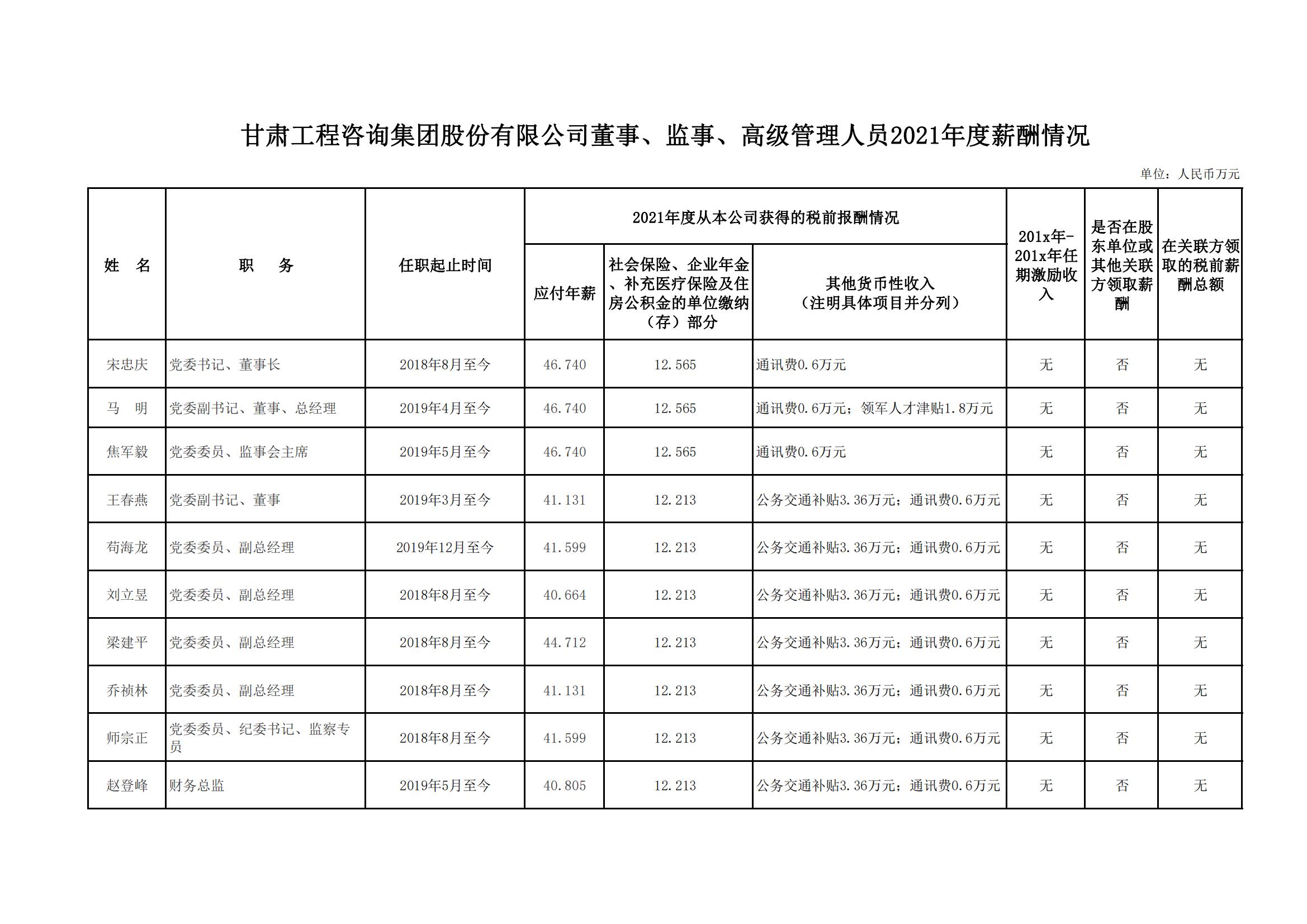 按照《關(guān)于印發(fā)甘肅省省屬國有企業(yè)負(fù)責(zé)人薪酬管理辦法的通知》(甘人社通〔2021〕310號)相關(guān)要求,現(xiàn)將甘肅工程咨詢集團(tuán)股份有限公司負(fù)責(zé)人2021年度薪酬情況公示如下: