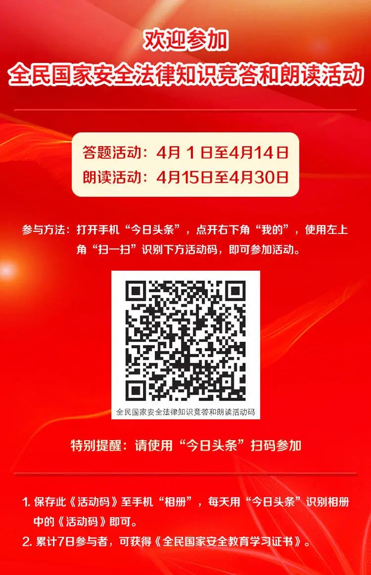 今年是國家安全法頒布施行10周年,4月15日是第十個全民國家安全教育日。為深入貫徹落實習近平總書記關于全面加強國家安全教育的重要指示批示精神,推進國家安全法治宣傳教育走深走實,增強全民國家安全意識和法治意識,倡議大家參加全民國家安全法律知識競答和朗讀活動。