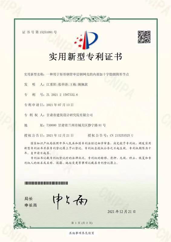 近日,從國(guó)家知識(shí)產(chǎn)權(quán)局傳來(lái)好消息,由建筑設(shè)計(jì)院總工程師張舉濤、設(shè)計(jì)四所總工程師江重陽(yáng)、設(shè)計(jì)五院總工程師王棟、設(shè)計(jì)四所工程師姚佩歆聯(lián)合申報(bào)的“一種用于矩形鋼管單層鋼網(wǎng)殼的內(nèi)部加十字肋圓筒形節(jié)點(diǎn)”技術(shù),喜獲國(guó)家實(shí)用新型專(zhuān)利。