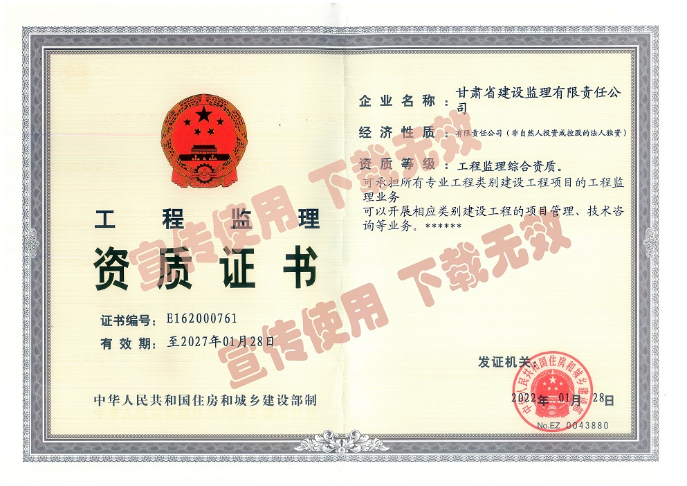 千淘萬漉雖辛苦,吹盡黃沙始到金。2月17日,甘肅省建設(shè)監(jiān)理有限責(zé)任公司正式取得工程監(jiān)理綜合資質(zhì),成為甘肅省本土唯一擁有綜合資質(zhì)的監(jiān)理企業(yè)。