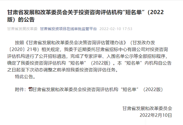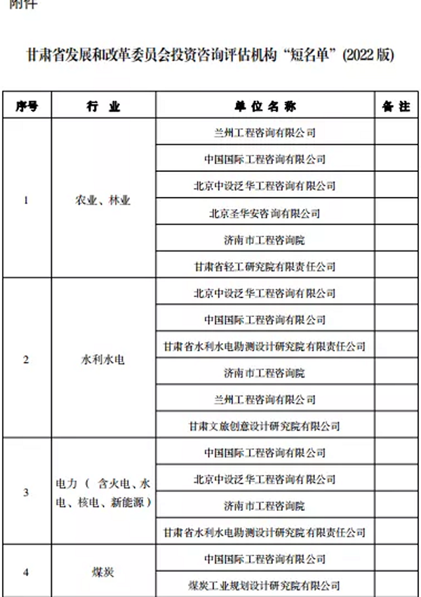 近日,省發(fā)改委公布2022年進入省發(fā)改委投資咨詢評估機構(gòu)企業(yè)名單,甘肅省水利水電勘測設(shè)計研究院有限責任公司成功入圍三個行業(yè)板塊。