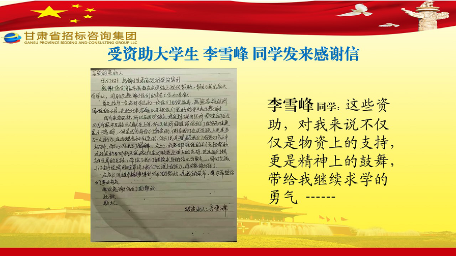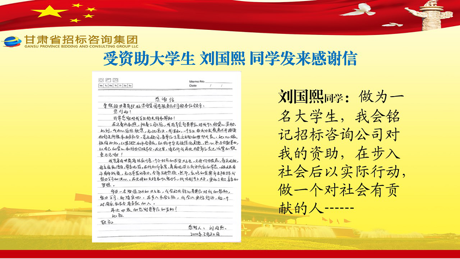 近日,張家川縣張棉驛鄉(xiāng)張棉村貧困大學(xué)生代表劉國熙、周長斌、李雪峰等向甘肅省招標(biāo)咨詢集團有限責(zé)任公司發(fā)來感謝信,就招標(biāo)咨詢集團給予學(xué)費資助一事表達(dá)他們的感激之情。