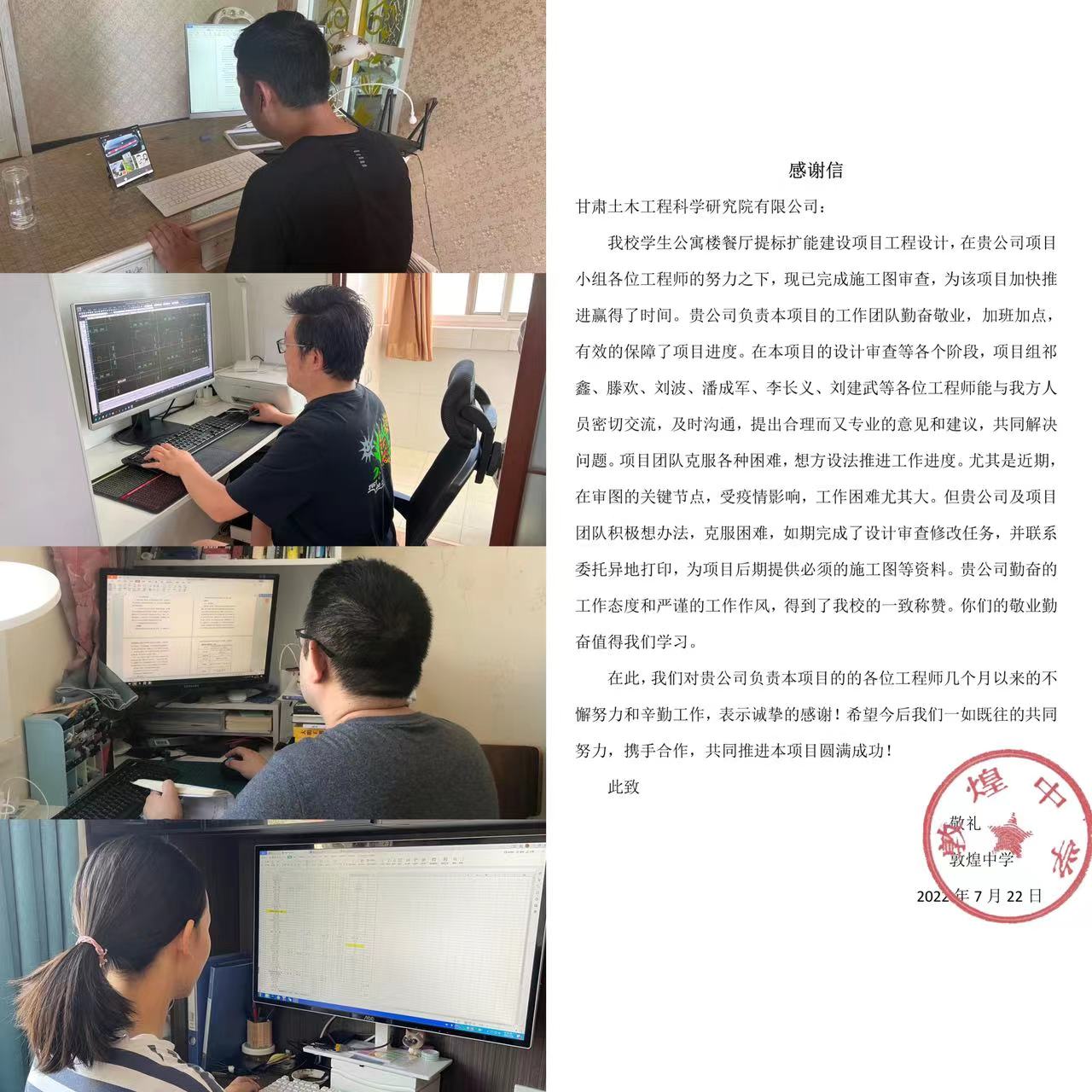 設(shè)計(jì)一所堅(jiān)決貫徹土木工程院黨委要求,第一時(shí)間部署疫情防控工作。在部門職工居家辦公期間,積極與軟件公司溝通協(xié)調(diào),為所有設(shè)計(jì)軟件增加了在線使用版,并利用釘釘、微信進(jìn)行線上溝通,疫情期間完成了2022年華亭市安口鎮(zhèn)老舊小區(qū)住宅樓棚戶區(qū)改造項(xiàng)目施工圖審查、甘肅武威工業(yè)園區(qū)天馬資源開發(fā)有限公司鋼結(jié)構(gòu)標(biāo)準(zhǔn)化廠房建設(shè)項(xiàng)目、敦煌中學(xué)學(xué)生公寓樓餐廳提標(biāo)擴(kuò)能建設(shè)等項(xiàng)目,得到建設(shè)單位的一致好評(píng)和致信感謝,極大提升了部門員工技術(shù)創(chuàng)新、全方位服務(wù)的工作熱情。