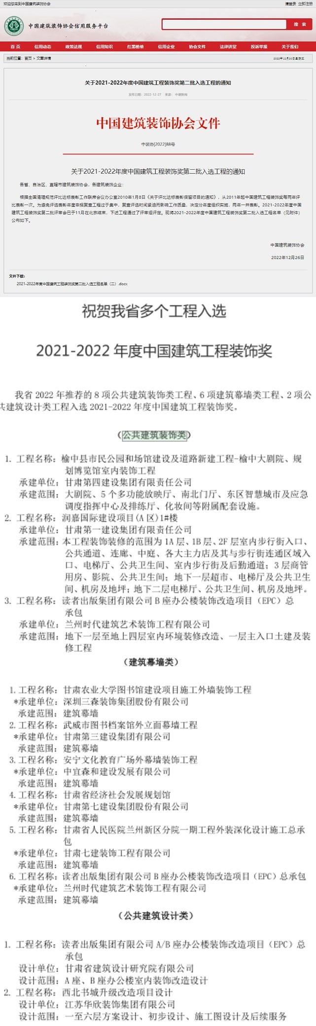 日前,2022年中國建筑工程裝飾獎評選結(jié)果揭曉,甘肅省建筑設(shè)計(jì)研究院有限公司多個項(xiàng)目榜上有名。其中,“甘肅省建筑設(shè)計(jì)研究院有限公司辦公樓消防改造及辦公環(huán)境提升改造項(xiàng)目”榮獲公共建筑裝飾類獎項(xiàng);“讀者出版集團(tuán)有限公司A/B座辦公樓裝飾改造項(xiàng)目”分別榮獲建筑幕墻類、公共建筑裝飾類和公共建筑設(shè)計(jì)類3項(xiàng)獎項(xiàng)。值得一提的是,建筑設(shè)計(jì)院子公司蘭州時代建筑藝術(shù)裝飾工程有限公司在此次獲獎中接連斬獲了3個獎項(xiàng)。截至目前,該公司已經(jīng)累計(jì)獲得7項(xiàng)中國建筑工程裝飾獎獎項(xiàng)。