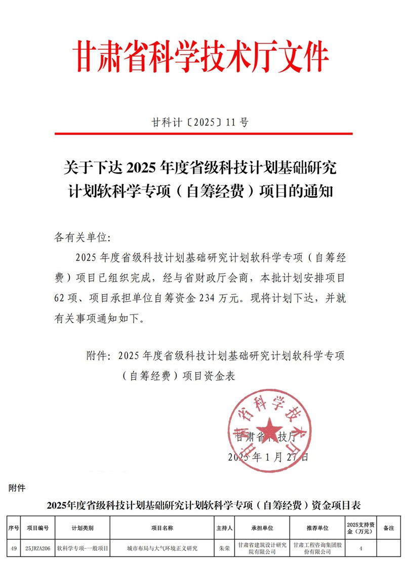 近日,甘肅省科技廳公布了2025年省級(jí)科技計(jì)劃基礎(chǔ)研究計(jì)劃軟科學(xué)專(zhuān)項(xiàng)(自籌經(jīng)費(fèi))項(xiàng)目立項(xiàng)結(jié)果,省建筑設(shè)計(jì)院申報(bào)的“城市布局與大氣環(huán)境正義研究”項(xiàng)目獲批立項(xiàng)。