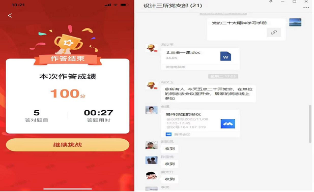 以賽促學(xué),強(qiáng)技礪能精研細(xì)琢。各黨支部組織黨員通過(guò)學(xué)習(xí)強(qiáng)國(guó)“黨的二十大精神答題活動(dòng)”“黨的二十大精神應(yīng)知應(yīng)會(huì)百題”等形式,開(kāi)展線上答題競(jìng)賽,全面檢驗(yàn)黨員干部對(duì)黨的二十大報(bào)告內(nèi)容的掌握程度,進(jìn)一步增強(qiáng)黨員干部對(duì)學(xué)習(xí)黨的二十大精神的認(rèn)識(shí)和重視,推動(dòng)黨的二十大精神入腦入心,鞏固提升學(xué)習(xí)效果,以賽促學(xué)、以知促行,用黨的二十大精神武裝頭腦、指導(dǎo)實(shí)踐、推動(dòng)工作。